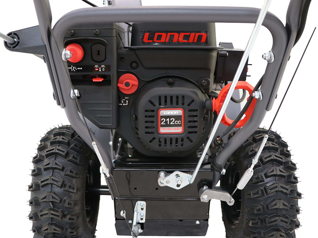 Электрический стартер, подключаемый к стандартной электросети 220В, гарантирует легкий запуск двигателя при низких температурах. Не может быть ничего проще – просто подключите удлинитель к штекеру и нажмите на красную кнопку для запуска двигателя. Направление выброса можно настраивать непосредственно с места оператора. Для изменения направления Вам необходимо поворачивать ручку влево или вправо, а для изменения угла выброса — вперед или назад. Блокировка ручки управления позволяет освободить одну из рук оператора, когда необходимо переключить скорость или отрегулировать направление выброса снега без остановки снегоуборщика.